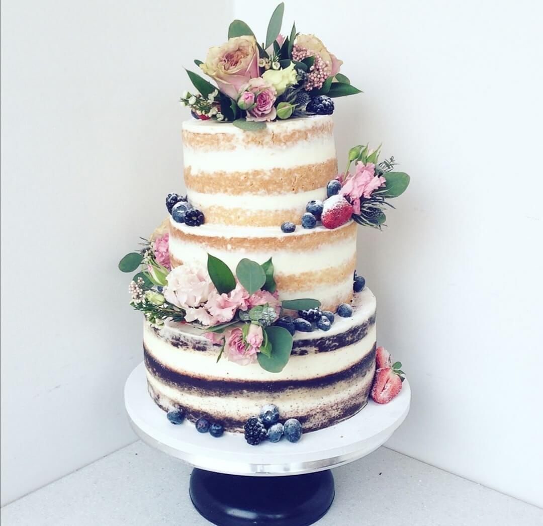 Трехъярусный тортик с декором из очаровательных цветов станет отличным украшением свадебного весера